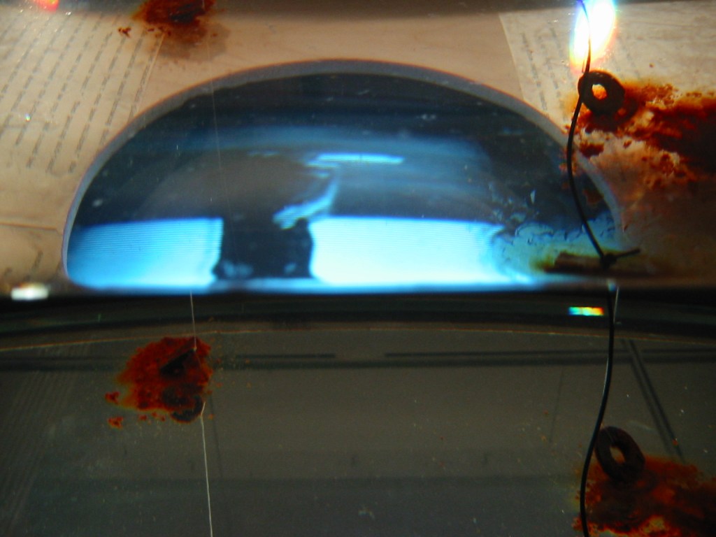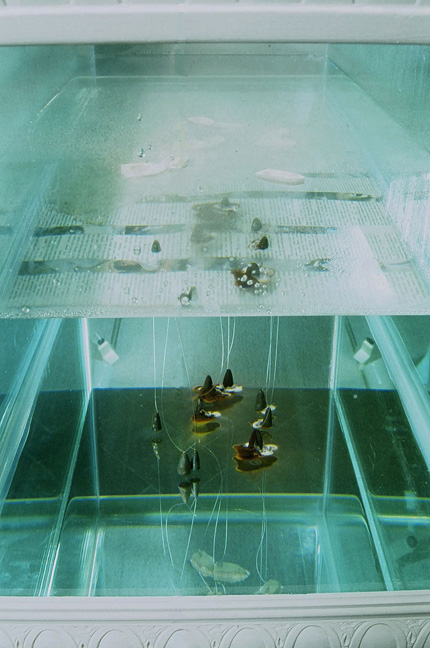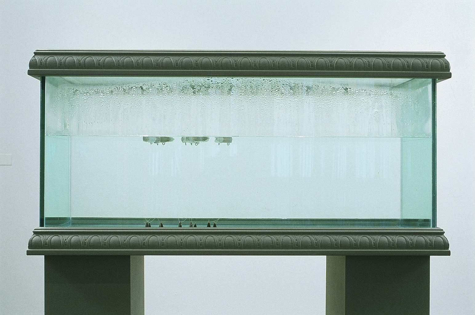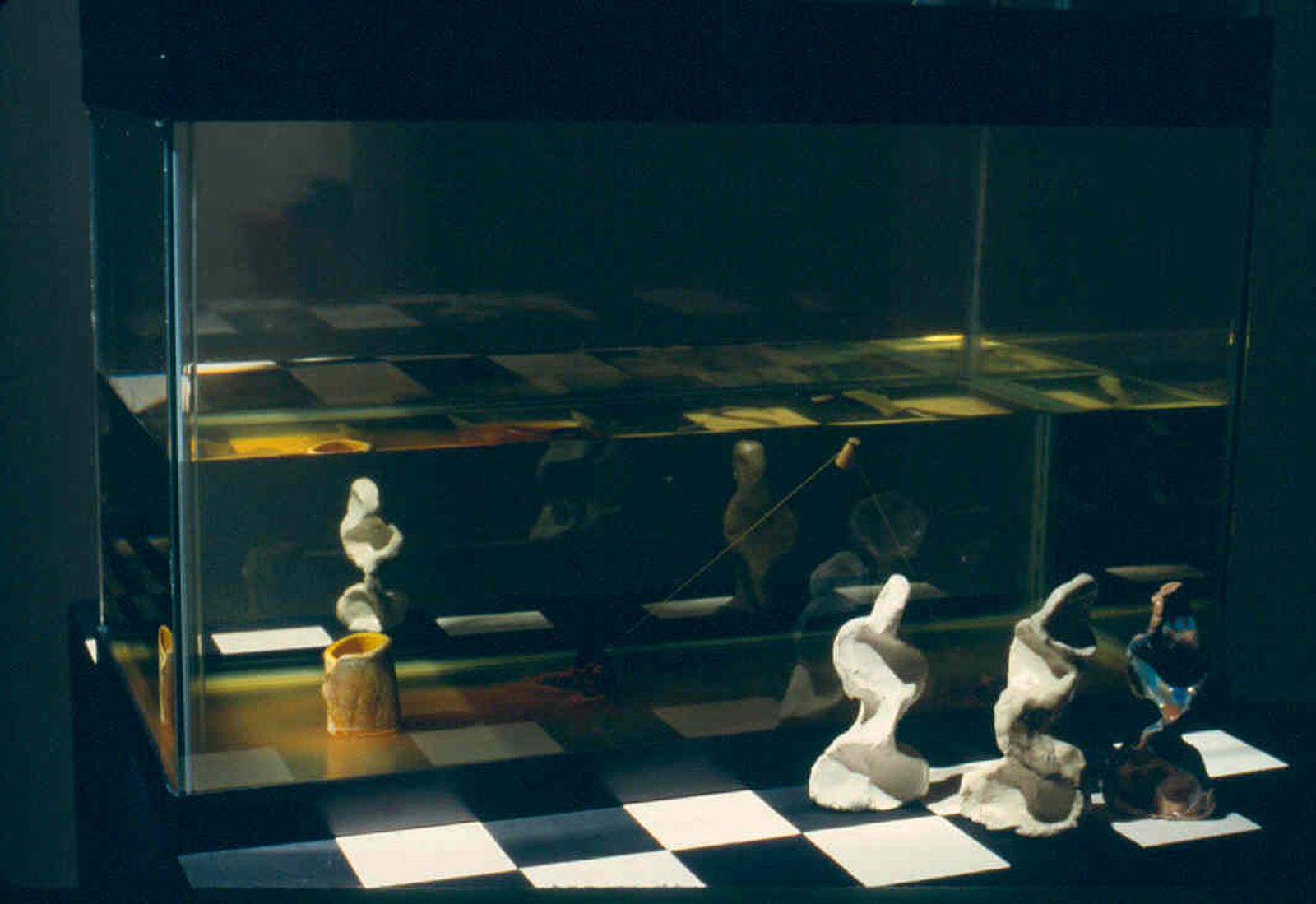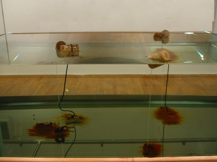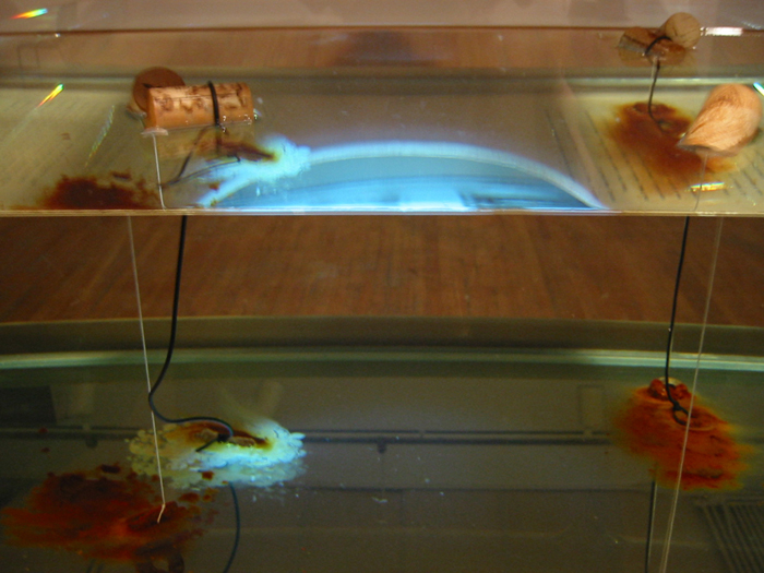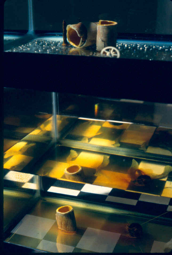 These pieces are built on the properties of water in glass: reflection, refraction, distortion, and mirroring. There are paintings or video or newspaper clippings under the bottom, but these are not visible unless the eye is above water line. Below, everything is mirrored.