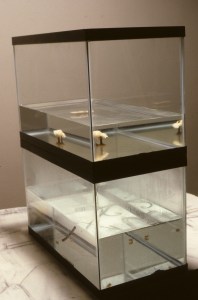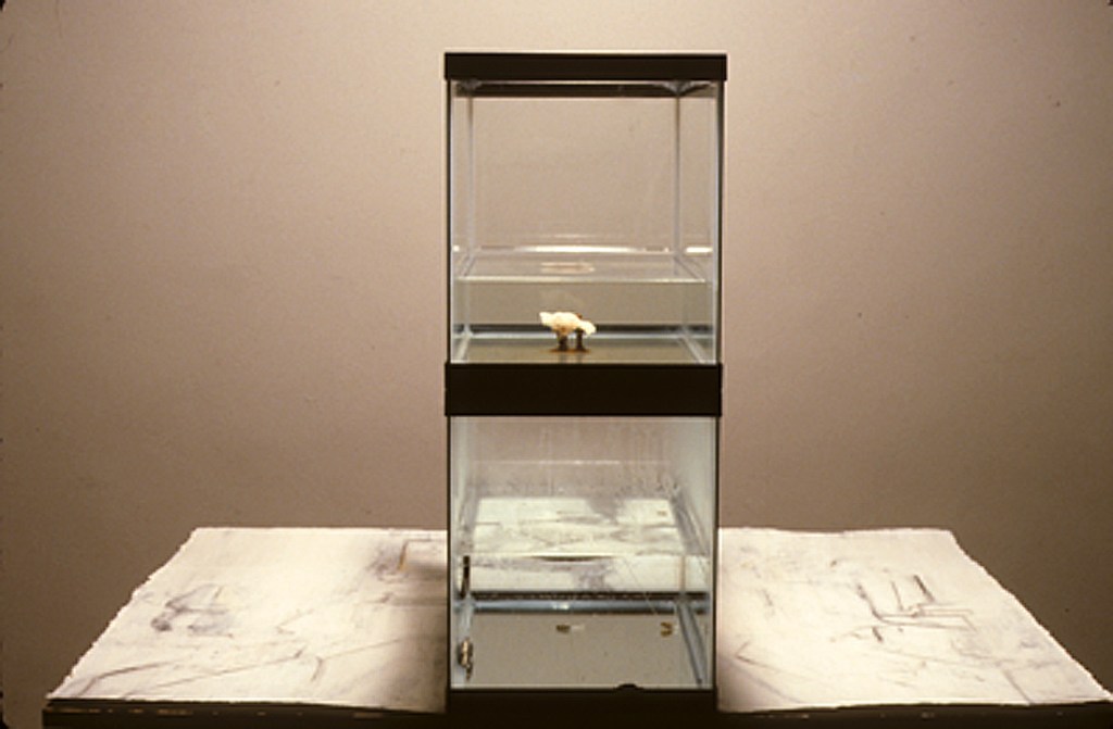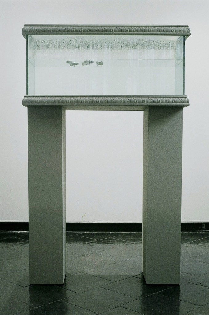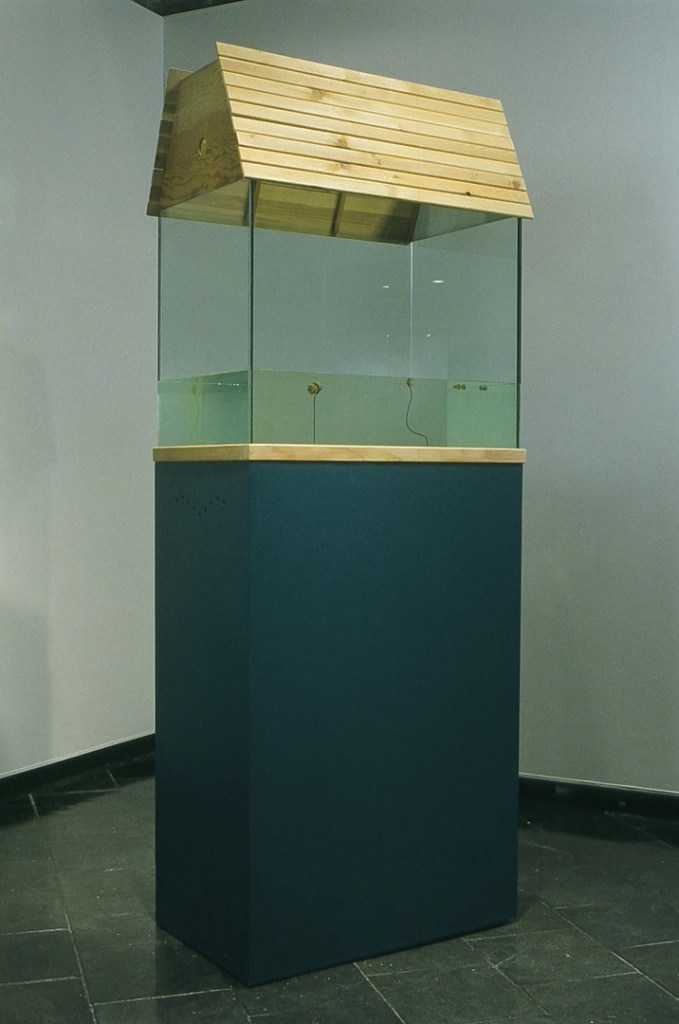 In this piece, forms sit outside looking in on a magical scene. In the upper chamber, the water evaporates and condenses against the top glass, and a steady soft rain falls.