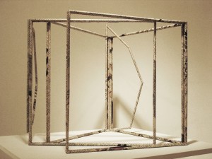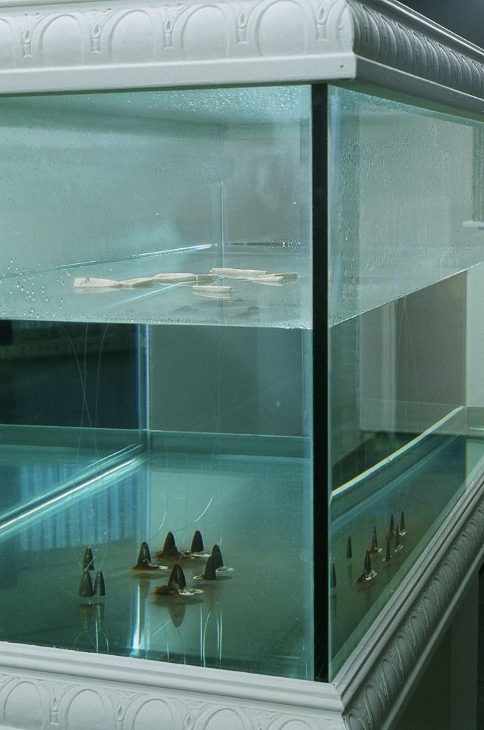 This piece is a memorial to the victims of the 2004 Indian Ocean tsunami. A few boats sit placidly on the water, anchored with lead. Multiplied and distorted, they sit over newspaper clippings and photos of the devastation.